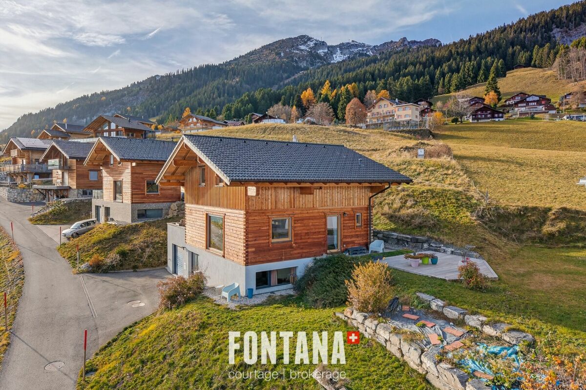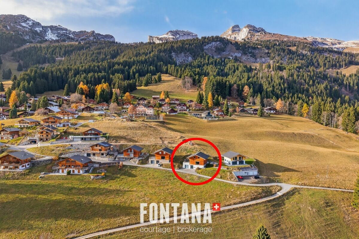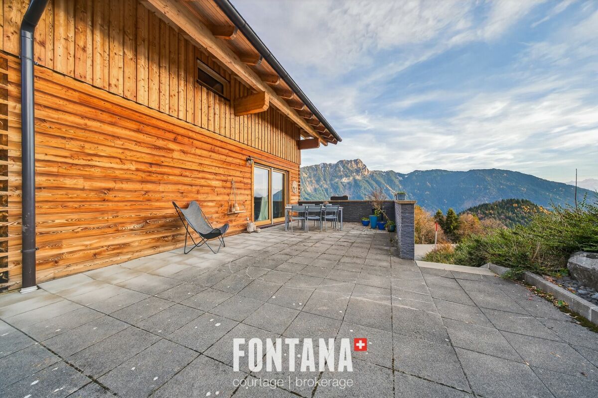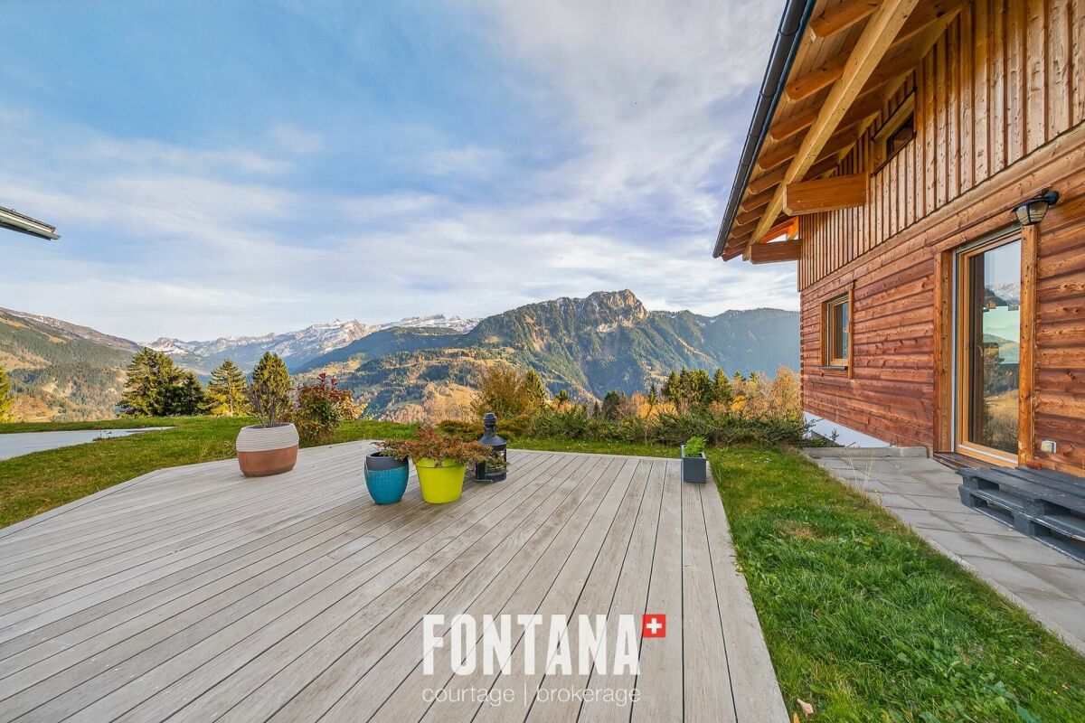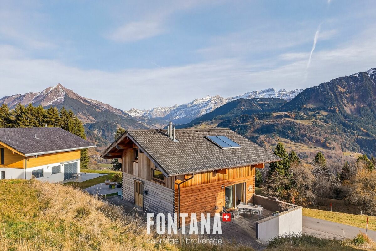 L’étage principal accueille un séjour très lumineux, doté de grandes baies vitrées et d’une cuisine ouverte moderne. Cet espace offre également la possibilité d’installer un poêle ou une cheminée, permettant d’enrichir l’ambiance chaleureuse du chalet. Une terrasse sud-est en bois offre une vue dégagée sur le Pic Chaussy et le massif des Diablerets, tandis qu’une terrasse sud-ouest dallée bénéficie d’un panorama exceptionnel sur les Dents du Midi et le Chamossaire. Grâce à son orientation idéale, le chalet profite d’un ensoleillement du lever au coucher du soleil, rendant ses espaces extérieurs particulièrement agréables en toute saison.